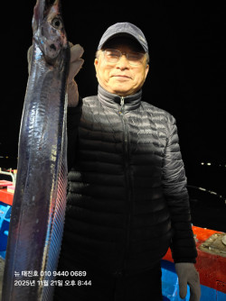반갑습니다간밤에 먼바다 갈치출항 다녀오는길입니다어제보다는 갈치조황은 못했습니다만 좋은씨알급들에 만족했습니다낮부터 한두마리씩 대치들이 나와오늘도 기대만탕 했습니다만 마리수는 부족햇습니다오늘하루 만바다쪽으로 바랑 많아 휴항하구요낼부터 정상출항 합니다*11월8일 토요일 갈치출항 예약마감*11월9일 일요일 갈치출항 자리여유 예약가능♤♤♤♤♤♤♤수도권 셔틀버스 운행안내♤♤♤♤♤♤♤♤수도권셔틀버스 문의전화 : 010-9425-4123상동호수공원 == 05시30분수원지지대쉼터==06시안성고가밑==07시목천IC ==07시20분수도권에서 출조하시는분들 편히 이용해 주세요 ========== ★ 태진피싱 출조안내 ★ ============1. 승선정원 : 22명 2. 대상어종 : 칼치, 뽈락, 열기, 주꾸미, 오징어 등 생활낚시 3. 출조시간 : 오후2시 출항 4. 네비주소 : 경남 거제시 둔덕면 내평1길 53준 비 물 : 대상어종에 따라 달라지므로 예약시 유선문의 바랍니다 ★ 개인지참물: 신분증, 구명조끼는 필수입니다. ★ ============================================== ■■■☞ 예약순서안내 ☜■■■ ★ 올해부터 저희 태진호는 자리배정은 추첨합니다. ★ ★ 홈페이지 바로가기 : http://newtaejinho.sunsang24.com/ 유선으로 예약확인을 받으신 다음 아래 계좌로 선입금을 하신후 태진피싱 010.9440.0689 로 입금확인 문자를 보내주시면 됩니다 ================> 선입금 계좌안내 <============== 수협 / 0010 9440 0689 / 예금주: 주호규 =================> 찾아오시는길 <================ 거제 IC (거제방면) → 구)거제대교 → 구)거제대교 지나서 우회전 → 술역마을 (약 4Km) 까지 직진(내평1길) → 태진피싱(이정표) 우회전 → 300m 직진후 우회전 → 태진피싱 및 주차 1. 태진피싱 예약문의 : 010-9440-0689 2. 선장직통 : 010-3836-8453 3. 위성전화 : 010-2959-8453 4. 배전화 : 070- 8891- 8452